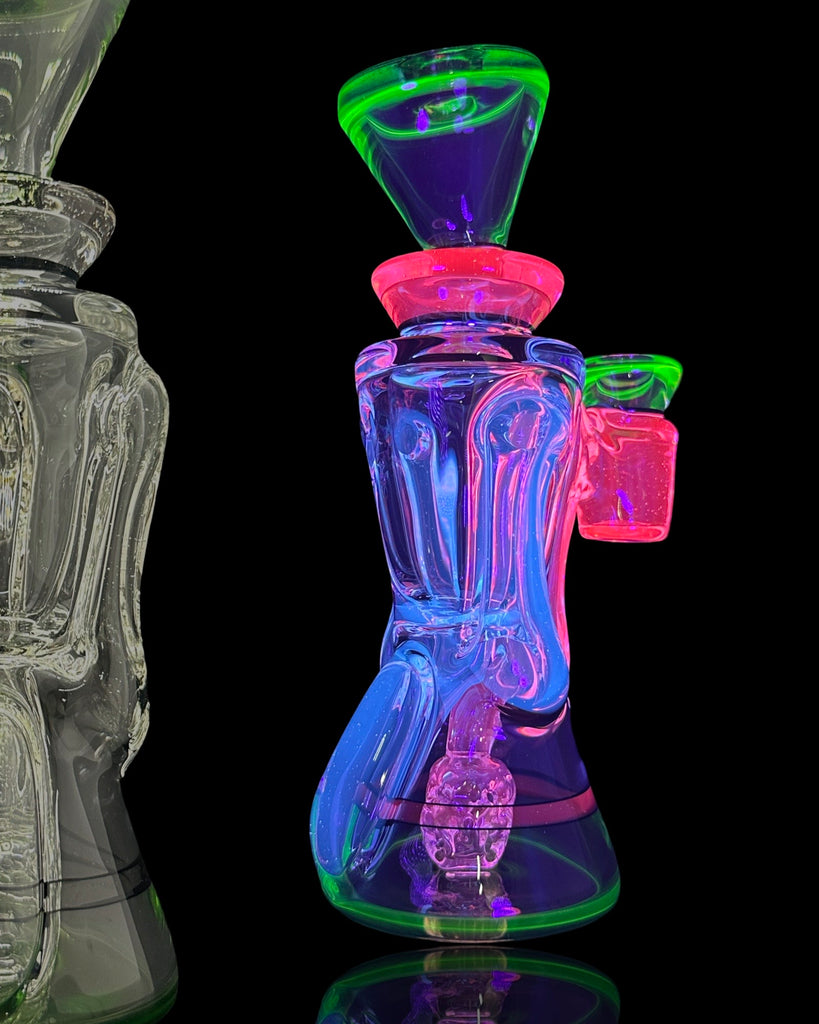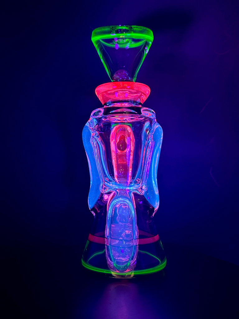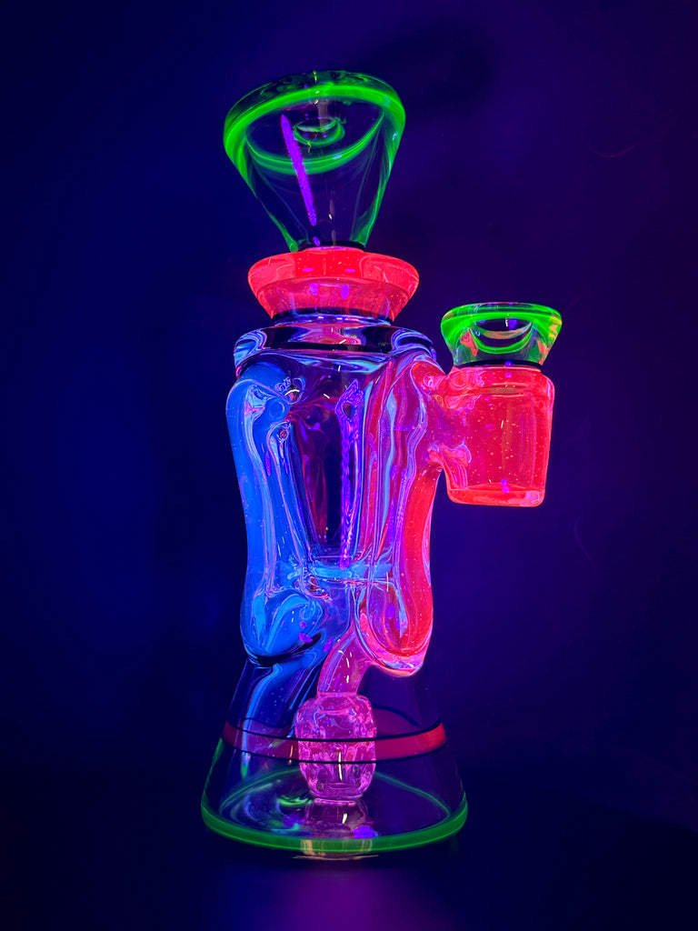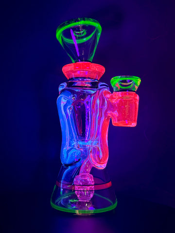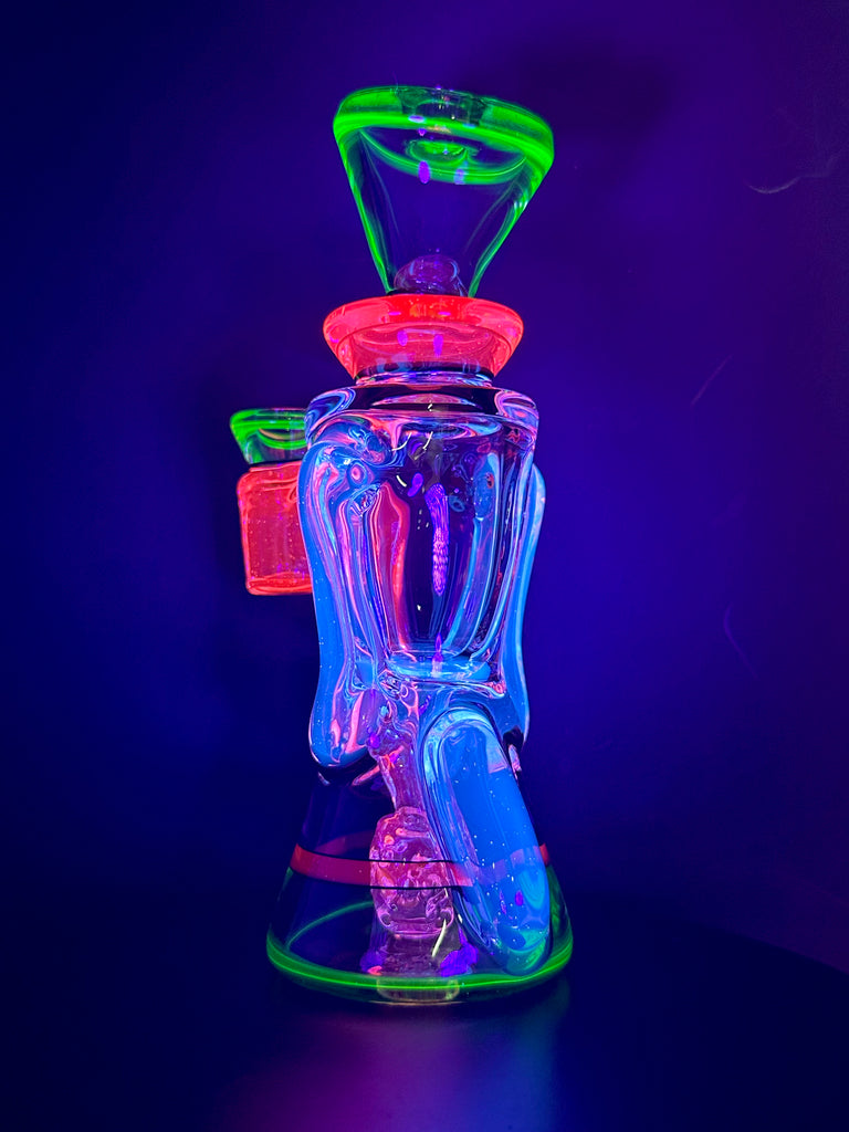 BRAND NEW 2025 Rycrafted double uptake gill recycler made in blue-v, ion, lucy, with jet black lip wraps. 7". 12 hole perc.